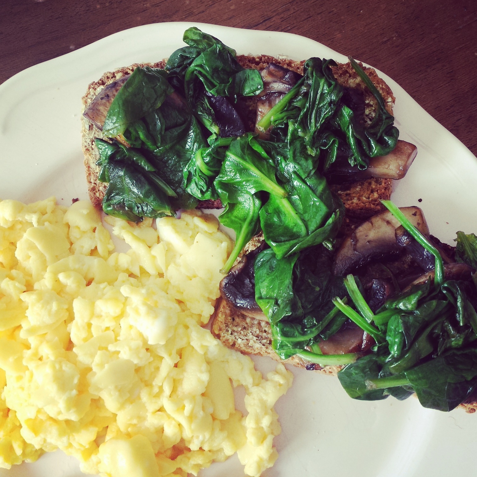 Toast 2 slices of soda bread and spread a light coating of butter on them both. Put the mushroom and spinach mixture on top of the toast and serve the scrambled eggs on the side.